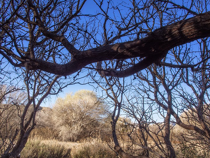 I've walked these familiar trails so many times over the course of a year and each time it's different. Whether it's Winter, Spring, Fall or Summer, I always see something new that sparks my eye. In winter, the Cottonwoods are shorn of their leaves and they stand bright white and black against the deep, blue sky. The mornings are crisp and cold, the light sharp, the birds in the trees just waking up to song. Soon, the green leaves will appear with the warmer days, and the same trail will be different and new once again.